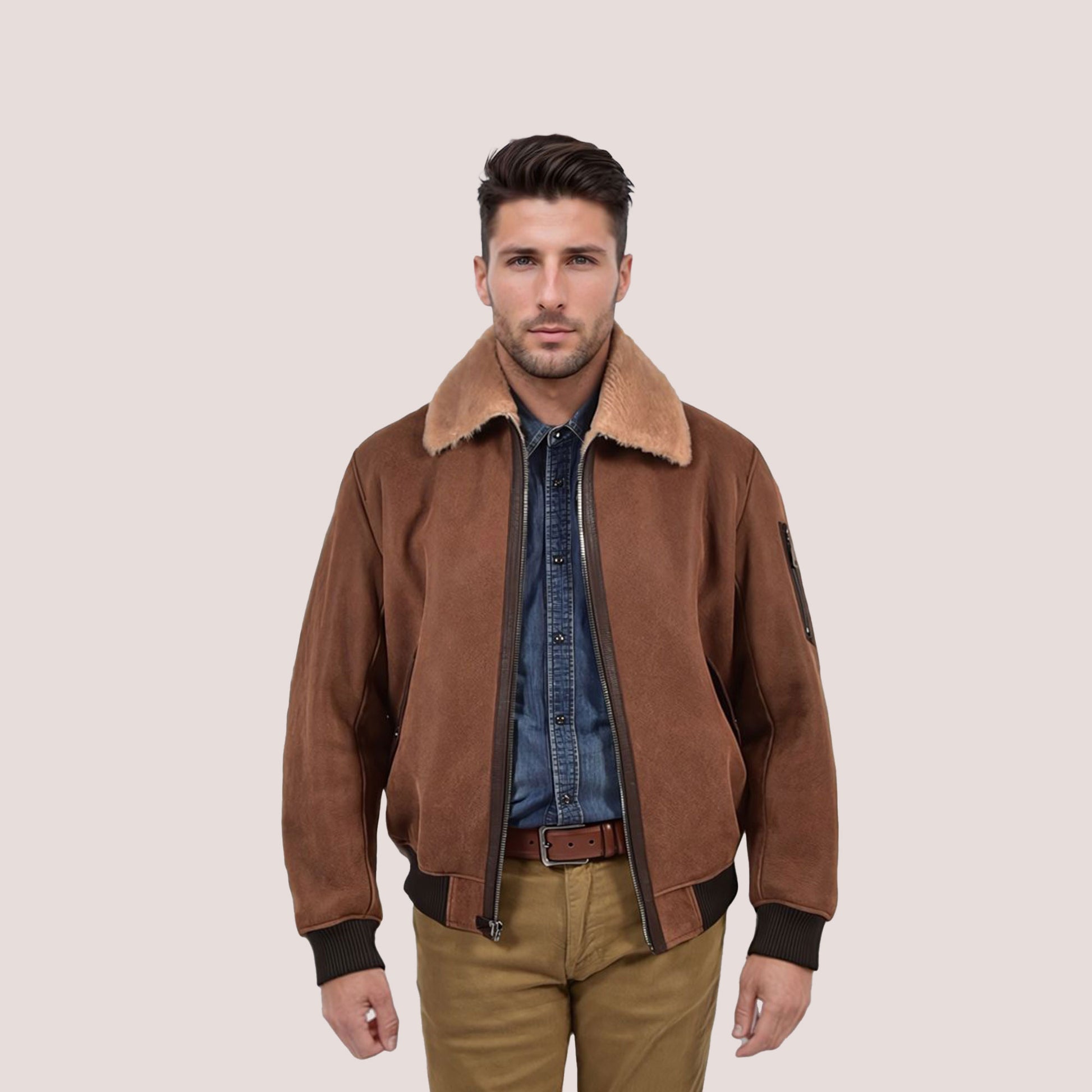 The Henry Sheepskin Jacket is ruggedly finished, offering a timeless shearling bomber style. With a zippered pocket on the sleeve and patched magnetic front pockets with flaps, it combines functionality and style. Inside, you'll find pockets perfectly fit for glasses or a phone, and one with a zip closure. As a natural insulator, it provides unequaled warmth, making it an essential addition to your wardrobe.