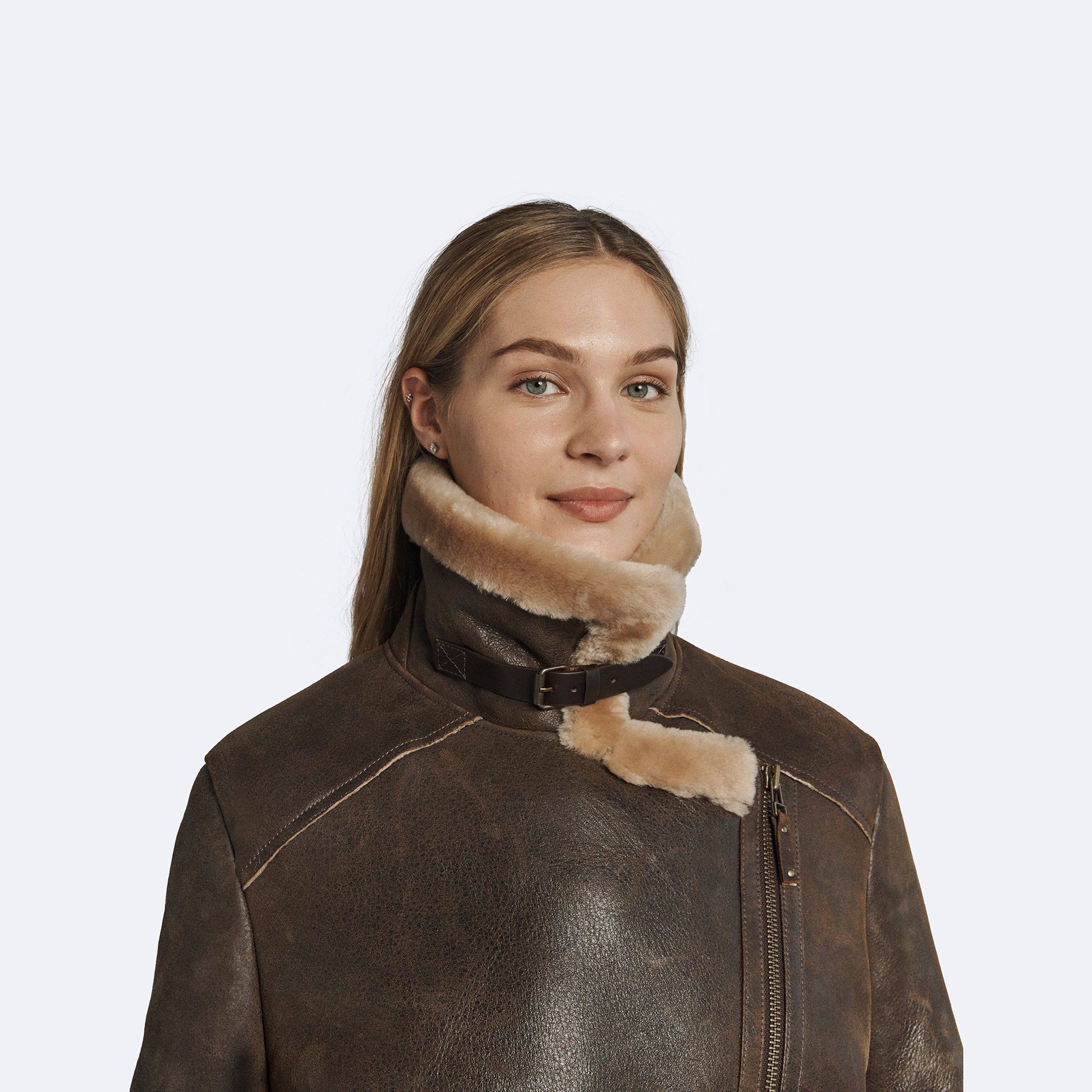 This edgy and oversized collar Lindsay shearling coat is perfect for a range of activities you can conquer during cold winter months. Featuring a cowhide contrast belt trim around the hem, it ties in the look of relaxed and warm. With a trendy asymmetrical zipper closure and convenient slash pockets, this coat combines style and functionality effortlessly.